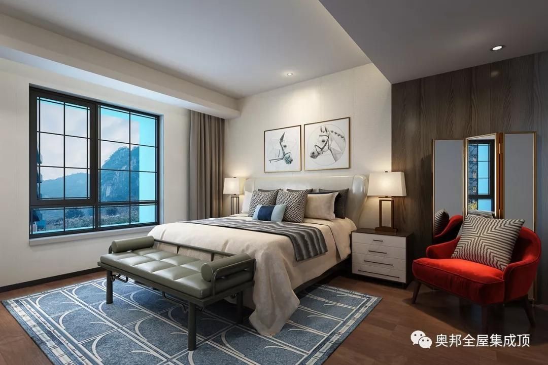 家最重要的地方是客房,不需要太亮堂,溫馨有情調(diào)是重點,吊頂不妨可以設(shè)計成高低錯落,顯得空間更寬闊;墻體也可以分隔成不同色調(diào),落地鏡和一張紅色小沙發(fā)來點綴,將空間完美利用。